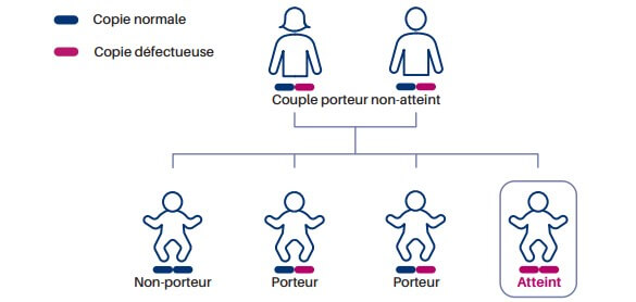 gène donné. Le risque d’avoir un enfant atteint dépend du hasard de la rencontre entre deux partenaires porteurs d’une mutation dans le même gène. Si au sein d’un couple, les deux partenaires sont porteurs de mutations sur le même gène, il existe une probabilité de 1/4 à chaque grossesse, soit 25%, d’avoir un enfant atteint de la maladie en question.