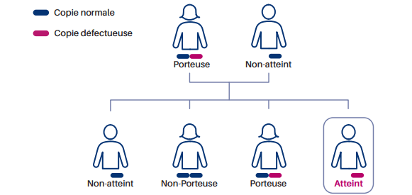 Tout individu hérite de deux copies de chaque gène : une copie maternelle et une copie paternelle. Les maladies autosomiques récessives se manifestent lorsqu’un individu hérite de mutations sur chacune des copies parentales d’un